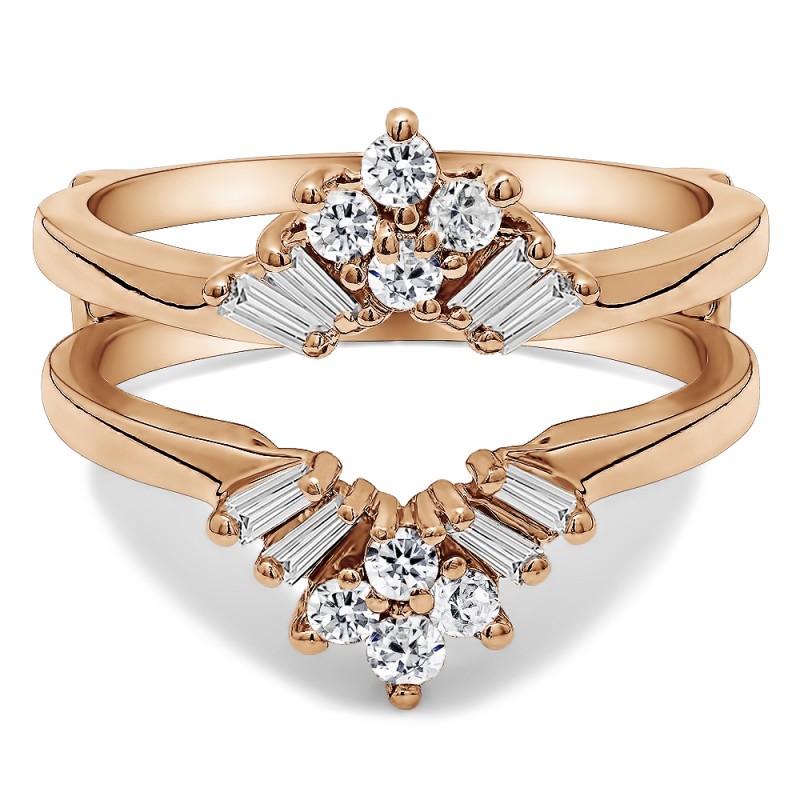 This wedding ring guard has 16 round, prong set stones. Each band measures 2.3 millimeters wide. This ring guard has 0.57 carats total weight. It is made to fit a round solitaire from 0.25 carats to 0.5, or a princess cut solitaire from 0.25 up to 0.25 carats.