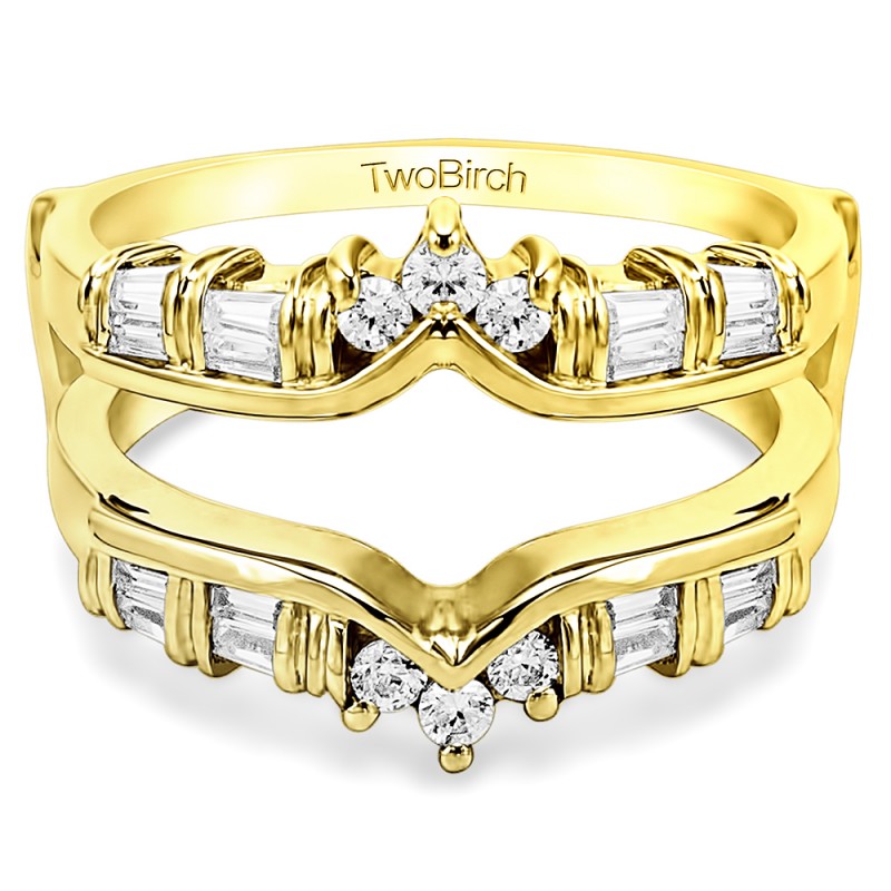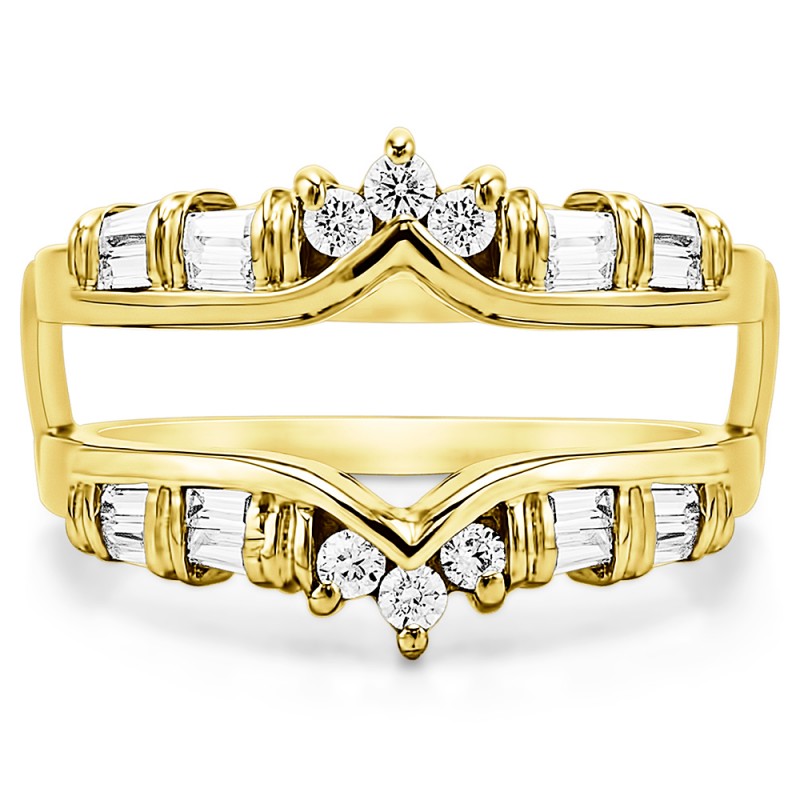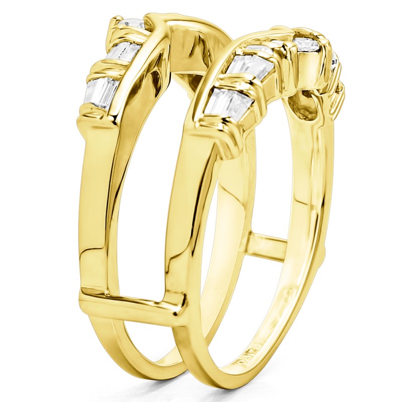 This wedding ring guard has 22 round, prong set stones. Each band measures 2.9 millimeters wide. This ring guard has 0.7 carats total weight. It is made to fit a round solitaire from 0.5 carats to 2, or a princess cut solitaire from 0.5 up to 1.5 carats.