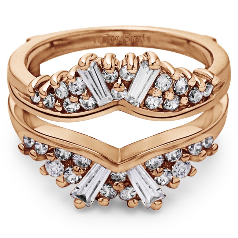 This wedding ring guard has 34 round, prong set stones. Each band measures 2.6 millimeters wide. This ring guard has 0.73 carats total weight. It is made to fit a round solitaire from 0.75 carats to 2, or a princess cut solitaire from 0.75 up to 2 carats.