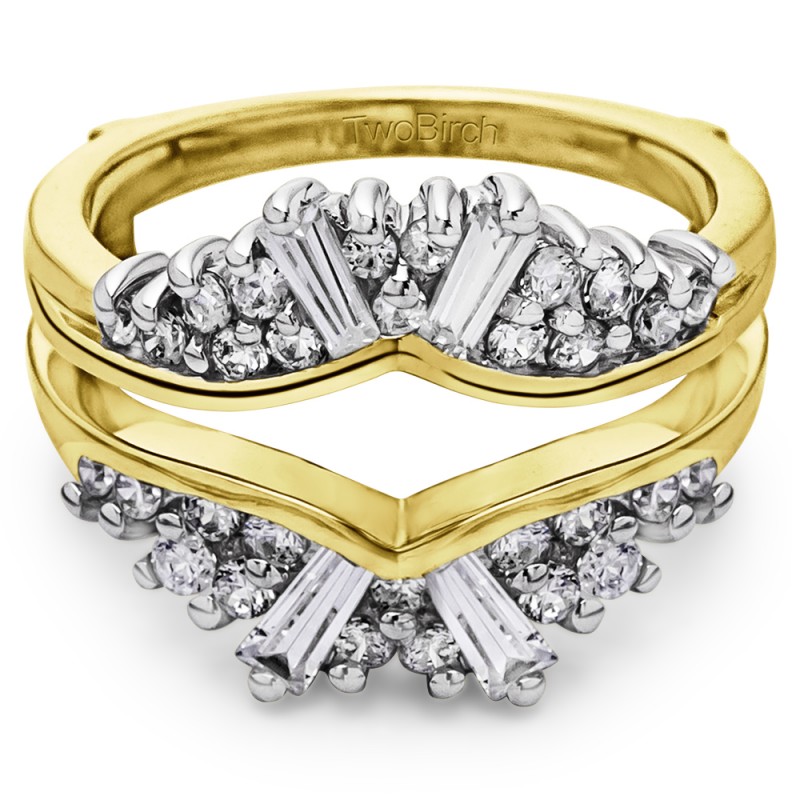 This wedding ring guard has 34 round, prong set stones. Each band measures 2.6 millimeters wide. This ring guard has 0.73 carats total weight. It is made to fit a round solitaire from 0.75 carats to 2, or a princess cut solitaire from 0.75 up to 2 carats.