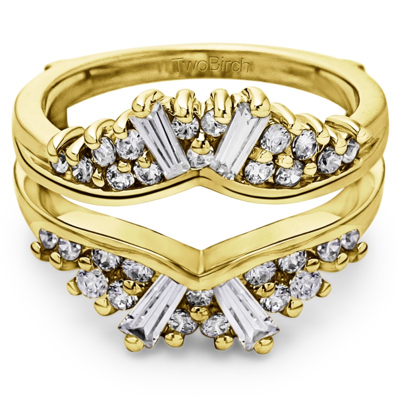 This wedding ring guard has 34 round, prong set stones. Each band measures 2.6 millimeters wide. This ring guard has 0.73 carats total weight. It is made to fit a round solitaire from 0.75 carats to 2, or a princess cut solitaire from 0.75 up to 2 carats.