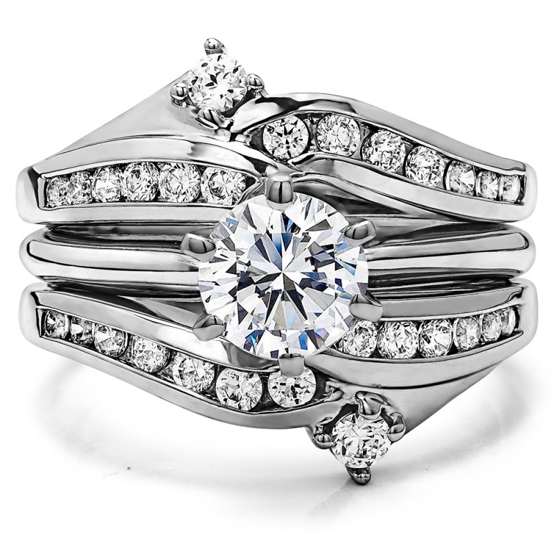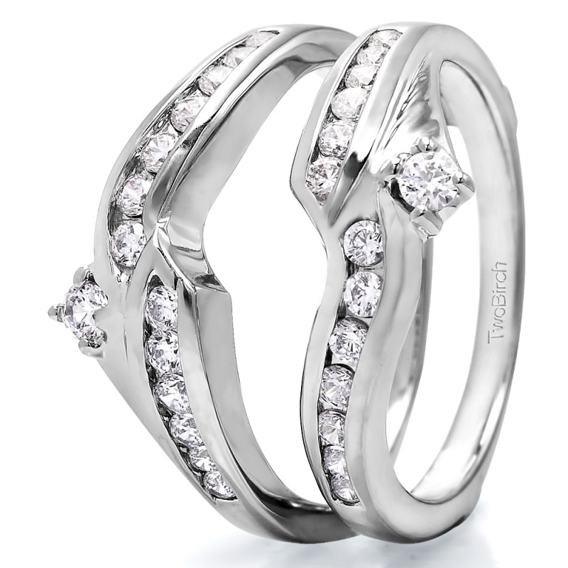 This wedding ring guard has 28 round, channel set stones. Each band measures 2 millimeters wide. This ring guard has 0.79 carats total weight.