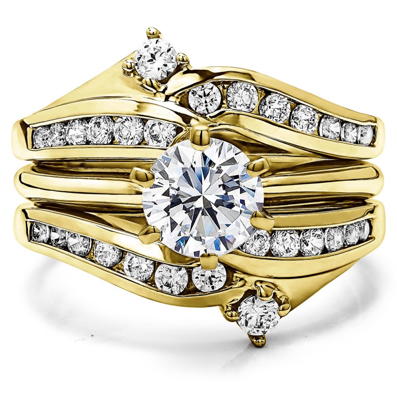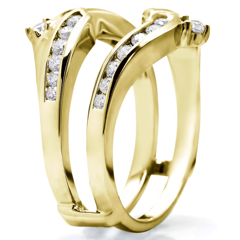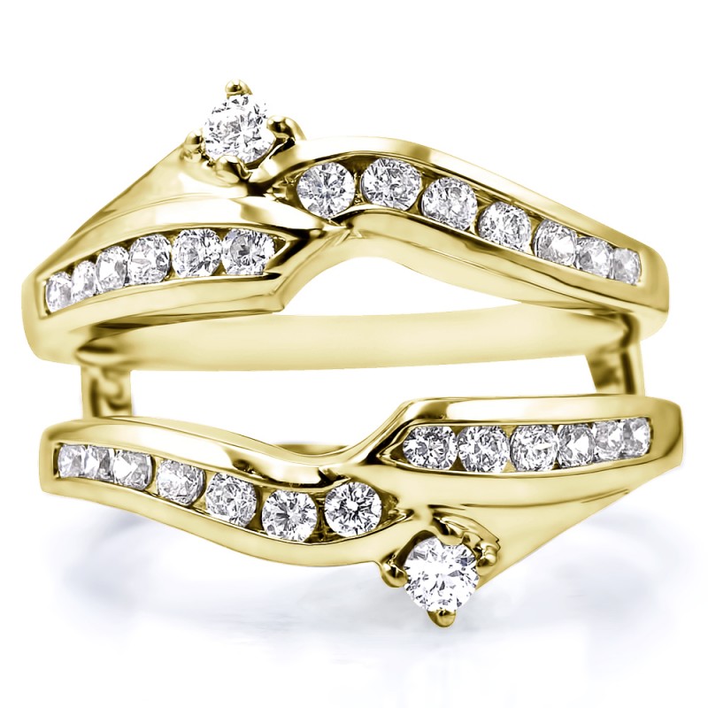 This wedding ring guard has 28 round, channel set stones. Each band measures 2 millimeters wide. This ring guard has 0.79 carats total weight.