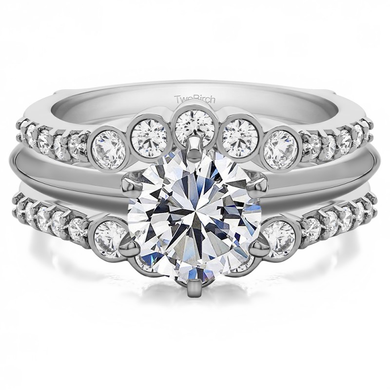This wedding ring guard has 30 round, prong set stones. Each band measures 2.01 millimeters wide. This ring guard has 0.7 carats total weight. It is made to fit a round solitaire from 0.25 carats to 1.5, or a princess cut solitaire from 0.25 up to 2, or a marquise solitaire from 0.5 up to 1.5 carats.