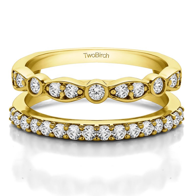 This wedding ring guard has 28 round, prong set stones. Each band measures 2.08 millimeters wide. This ring guard has 0.7 carats total weight. It is made to fit a round solitaire from 0.25 carats to 1.5, or a princess cut solitaire from 0.25 up to 2 carats.