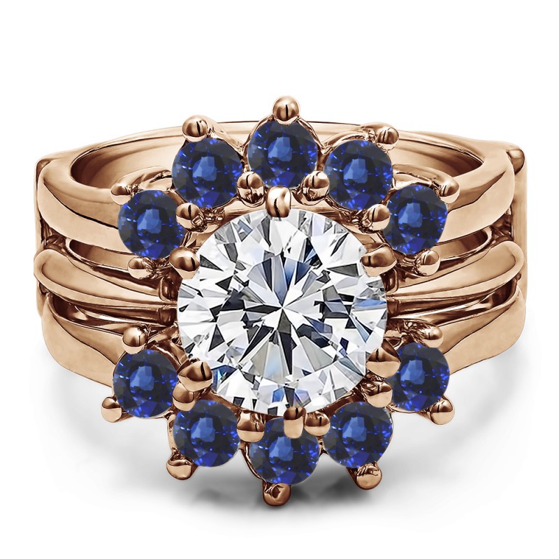 This wedding ring guard has 10 round, prong set stones. Each band measures 2.5 millimeters wide. This ring guard has 0.2 carats total weight. It is made to fit a round solitaire from 0.25 carats to 2, or a princess cut solitaire from 0.5 up to 2 carats.
