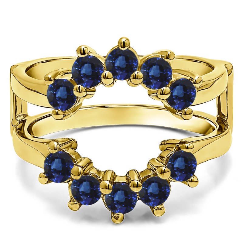 This wedding ring guard has 10 round, prong set stones. Each band measures 2.5 millimeters wide. This ring guard has 0.2 carats total weight. It is made to fit a round solitaire from 0.25 carats to 2, or a princess cut solitaire from 0.5 up to 2 carats.