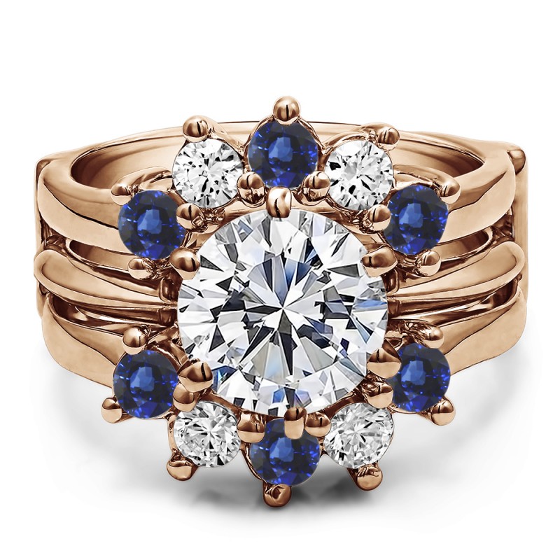 This wedding ring guard has 10 round, prong set stones. Each band measures 2.5 millimeters wide. This ring guard has 0.2 carats total weight. It is made to fit a round solitaire from 0.25 carats to 2, or a princess cut solitaire from 0.5 up to 2 carats.