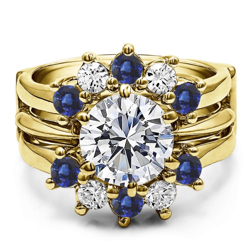 This wedding ring guard has 10 round, prong set stones. Each band measures 2.5 millimeters wide. This ring guard has 0.2 carats total weight. It is made to fit a round solitaire from 0.25 carats to 2, or a princess cut solitaire from 0.5 up to 2 carats.