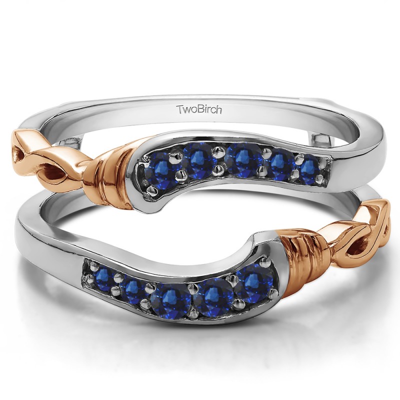 This wedding ring guard has 10 round, prong set stones. Each band measures 2.34 millimeters wide. This ring guard has 0.22 carats total weight. It is made to fit a round solitaire from 0.5 carats to 1, or a princess cut solitaire from 0.5 up to 2, or a marquise solitaire from 0.5 up to 1.5 carats.
