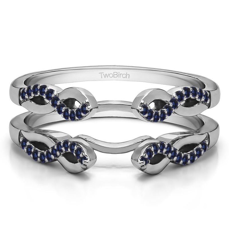 This wedding ring guard has 44 round, prong set stones. Each band measures 2 millimeters wide. This ring guard has 0.22 carats total weight.