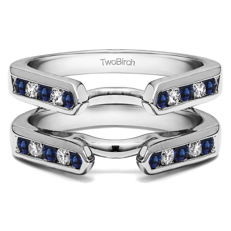 This wedding ring guard has 24 round, channel set stones. Each band measures 2 millimeters wide. This ring guard has 0.24 carats total weight. It is made to fit a round solitaire from 0.25 carats to 2, or a princess cut solitaire from 0.3 up to 2, or a marquise solitaire from 0.3 up to 1 carats.