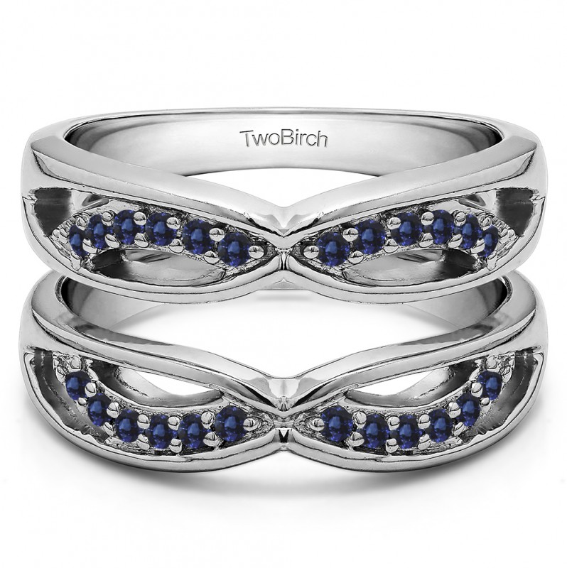 This wedding ring guard has 24 round, channel set stones. Each band measures 2.5 millimeters wide. This ring guard has 0.24 carats total weight. It is made to fit a round or princess cut solitaire from 0.25 carats to 2 carats.