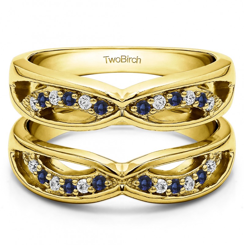 This wedding ring guard has 24 round, channel set stones. Each band measures 2.5 millimeters wide. This ring guard has 0.24 carats total weight. It is made to fit a round or princess cut solitaire from 0.25 carats to 2 carats.