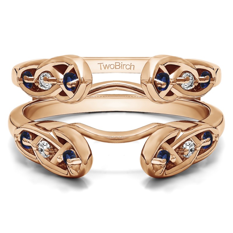 This wedding ring guard has 12 round, channel set stones. Each band measures 2 millimeters wide. This ring guard has 0.24 carats total weight.