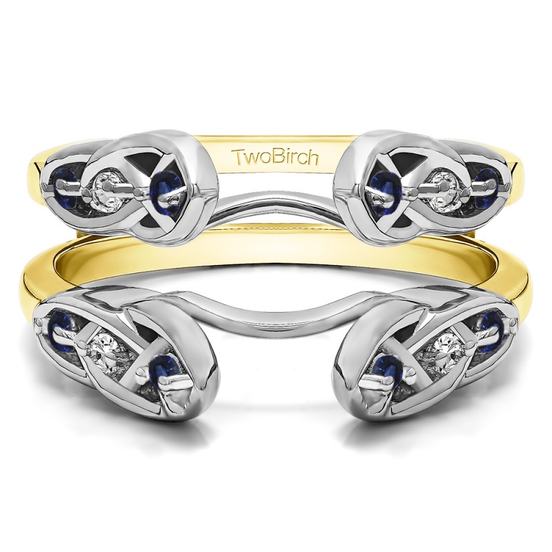 This wedding ring guard has 12 round, channel set stones. Each band measures 2 millimeters wide. This ring guard has 0.24 carats total weight.