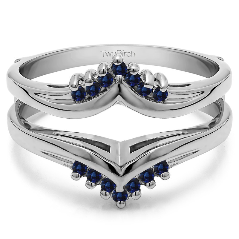 This wedding ring guard has 14 round, prong set stones. Each band measures 2.9 millimeters wide. This ring guard has 0.25 carats total weight. It is made to fit a round solitaire from 0.25 carats to 2, or a princess cut solitaire from 0.5 up to 1.5 carats.