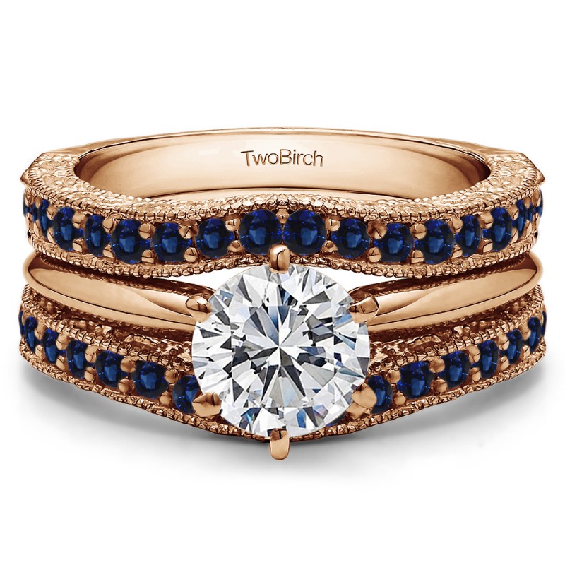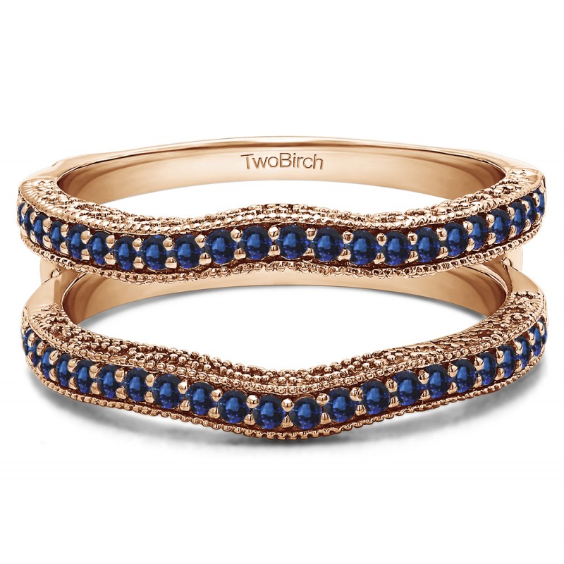 This wedding ring guard has 52 round, channel set stones. Each band measures 2 millimeters wide. This ring guard has 0.26 carats total weight. It is made to fit a round, princess, or marquise cut solitaire from 0.25 carats to 1 carats.