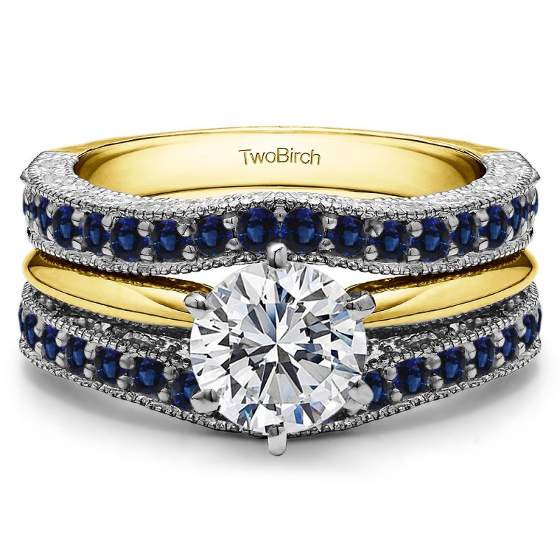 This wedding ring guard has 52 round, channel set stones. Each band measures 2 millimeters wide. This ring guard has 0.26 carats total weight. It is made to fit a round, princess, or marquise cut solitaire from 0.25 carats to 1 carats.