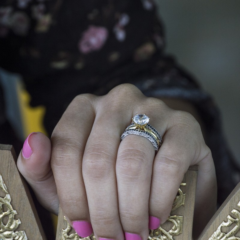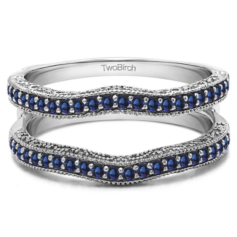 This wedding ring guard has 52 round, channel set stones. Each band measures 2 millimeters wide. This ring guard has 0.26 carats total weight. It is made to fit a round, princess, or marquise cut solitaire from 0.25 carats to 1 carats.
