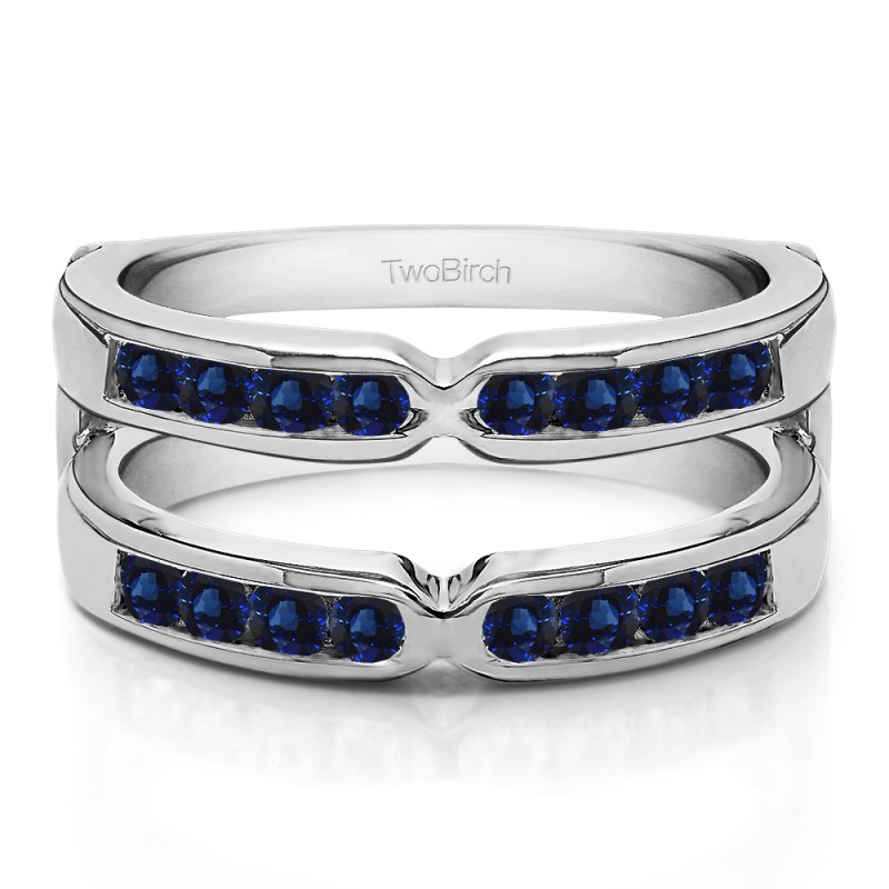 This wedding ring guard has 24 round, channel set stones. Each band measures 1.8 millimeters wide. This ring guard has 0.26 carats total weight. It is made to fit a round solitaire from 0.2 carats to 0.45, or a princess cut solitaire from 0.2 up to 0.75, or a marquise solitaire from 0.25 up to 0.5 carats.