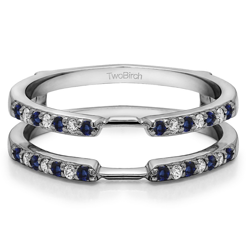 This wedding ring guard has 28 round, prong set stones. Each band measures 2 millimeters wide. This ring guard has 0.28 carats total weight. It is made to fit a round solitaire from 0.25 carats to 2, or a princess cut solitaire from 0.25 up to 1.5, or a marquise solitaire from 0.25 up to 1 carats.