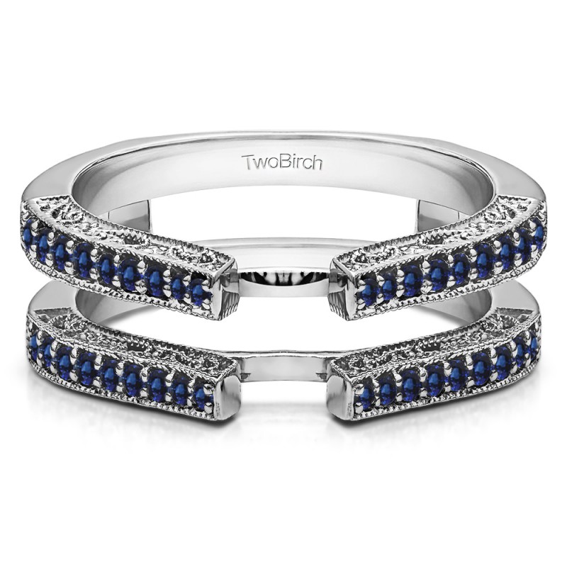 This wedding ring guard has 36 round, channel set stones. Each band measures 2 millimeters wide. This ring guard has 0.29 carats total weight. It is made to fit a round solitaire from 0.75 carats to 1.5, or a princess cut solitaire from 1 up to 2, or a marquise solitaire from 0.5 up to 1 carats.