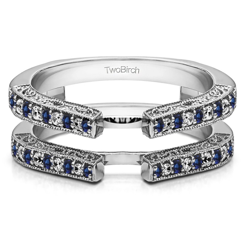 This wedding ring guard has 36 round, channel set stones. Each band measures 2 millimeters wide. This ring guard has 0.29 carats total weight. It is made to fit a round solitaire from 0.75 carats to 1.5, or a princess cut solitaire from 1 up to 2, or a marquise solitaire from 0.5 up to 1 carats.