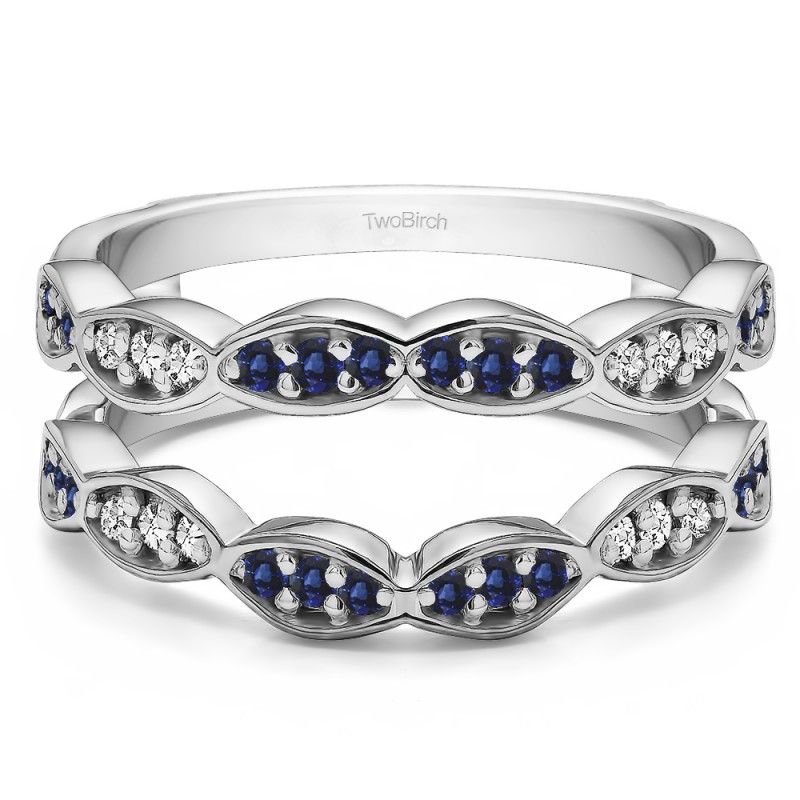 This wedding ring guard has 36 round, prong set stones. Each band measures 2.28 millimeters wide. This ring guard has 0.3 carats total weight. It is made to fit a round or marquise cut solitaire from 0.5 carats to 1.5, or a princess cut solitaire from 0.5 up to 2 carats.
