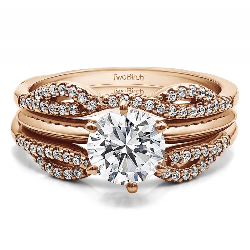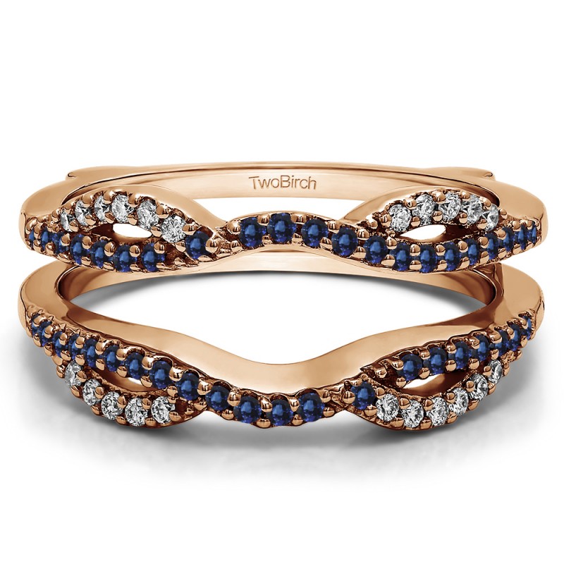 This wedding ring guard has 64 round, prong set stones. Each band measures 2 millimeters wide. This ring guard has 0.32 carats total weight.