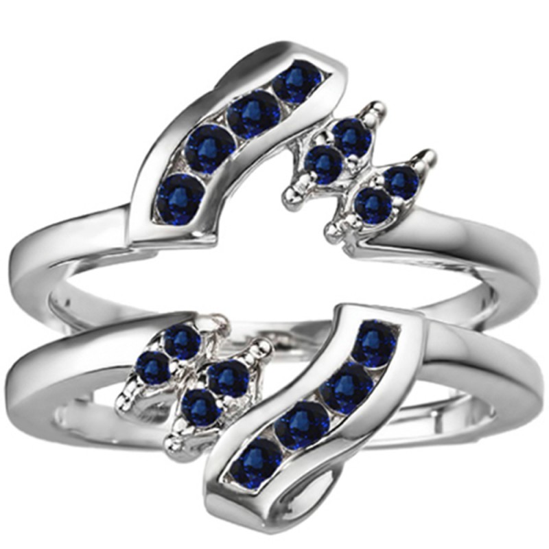 This wedding ring guard has 16 round, channel set stones. Each band measures 2.6 millimeters wide. This ring guard has 0.36 carats total weight. It is made to fit a round or princess cut solitaire from 0.25 carats to 2 carats.