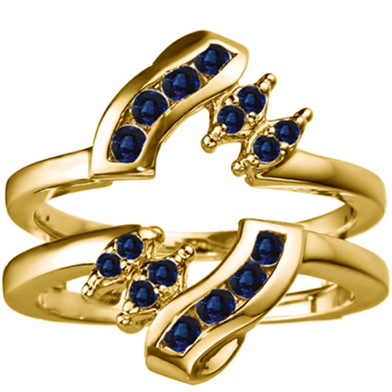 This wedding ring guard has 16 round, channel set stones. Each band measures 2.6 millimeters wide. This ring guard has 0.36 carats total weight. It is made to fit a round or princess cut solitaire from 0.25 carats to 2 carats.