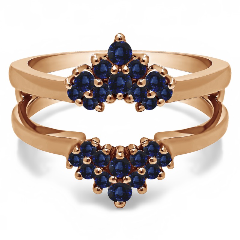 This wedding ring guard has 24 round, prong set stones. Each band measures 2.7 millimeters wide. This ring guard has 0.37 carats total weight. It is made to fit a round solitaire from 0.25 carats to 0.5, or a princess cut solitaire from 0.2 up to 0.2 carats.