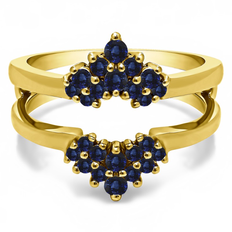 This wedding ring guard has 24 round, prong set stones. Each band measures 2.7 millimeters wide. This ring guard has 0.37 carats total weight. It is made to fit a round solitaire from 0.25 carats to 0.5, or a princess cut solitaire from 0.2 up to 0.2 carats.