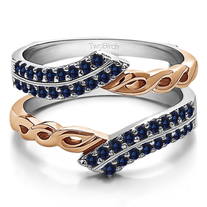 This wedding ring guard has 38 round, prong set stones. Each band measures 2.55 millimeters wide. This ring guard has 0.38 carats total weight. It is made to fit a round or princess cut solitaire from 0.5 carats to 2, or a marquise solitaire from 0.5 up to 1.5 carats.