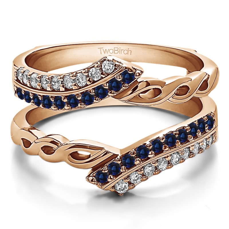 This wedding ring guard has 38 round, prong set stones. Each band measures 2.55 millimeters wide. This ring guard has 0.38 carats total weight. It is made to fit a round or princess cut solitaire from 0.5 carats to 2, or a marquise solitaire from 0.5 up to 1.5 carats.