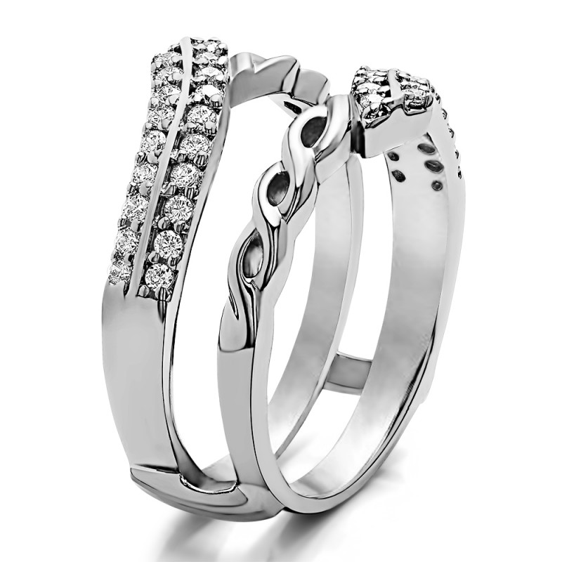 This wedding ring guard has 38 round, prong set stones. Each band measures 2.55 millimeters wide. This ring guard has 0.38 carats total weight. It is made to fit a round or princess cut solitaire from 0.5 carats to 2, or a marquise solitaire from 0.5 up to 1.5 carats.