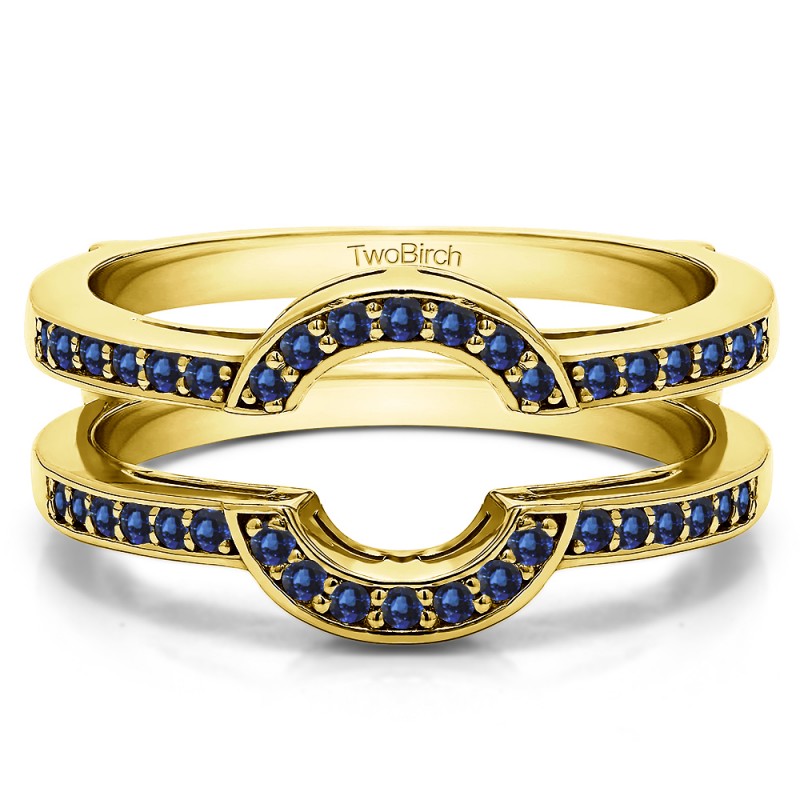 This wedding ring guard has 38 round, channel set stones. Each band measures 2 millimeters wide. This ring guard has 0.38 carats total weight. It is made to fit a round solitaire from 0.5 carats to 1 carats.
