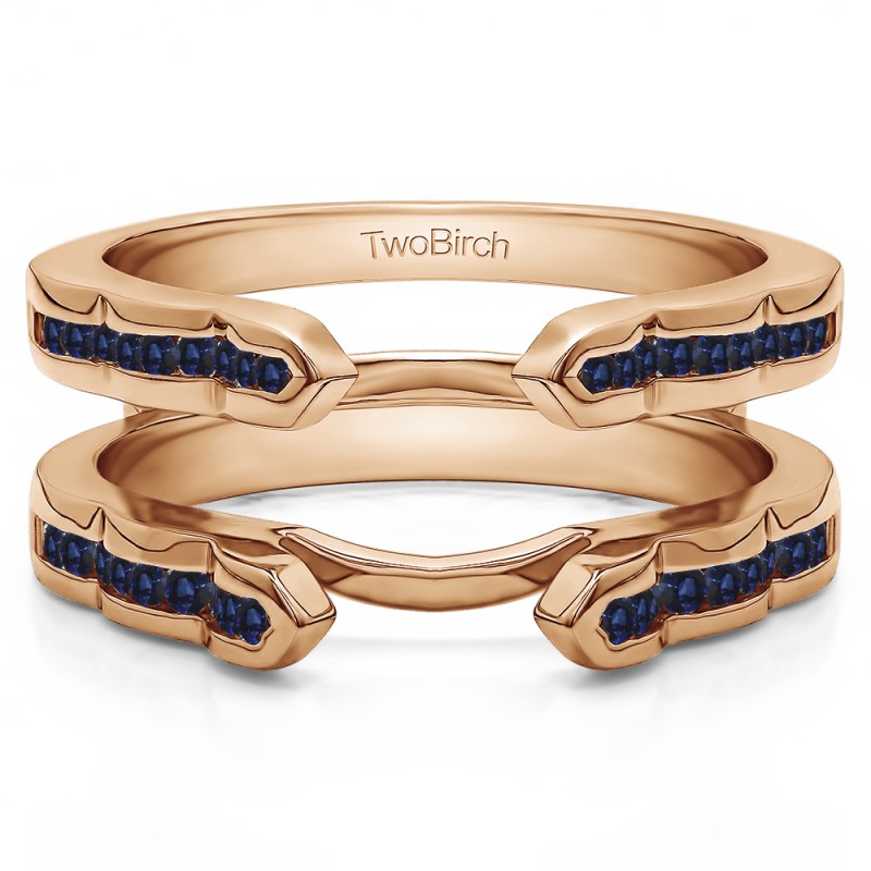This wedding ring guard has 40 round, channel set stones. Each band measures 2 millimeters wide. This ring guard has 0.4 carats total weight. It is made to fit a round or marquise cut solitaire from 0.5 carats to 2, or a princess cut solitaire from 0.75 up to 2 carats.