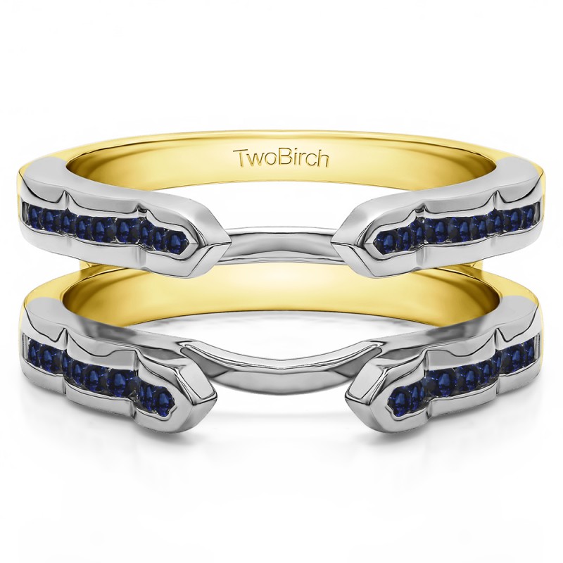 This wedding ring guard has 40 round, channel set stones. Each band measures 2 millimeters wide. This ring guard has 0.4 carats total weight. It is made to fit a round or marquise cut solitaire from 0.5 carats to 2, or a princess cut solitaire from 0.75 up to 2 carats.