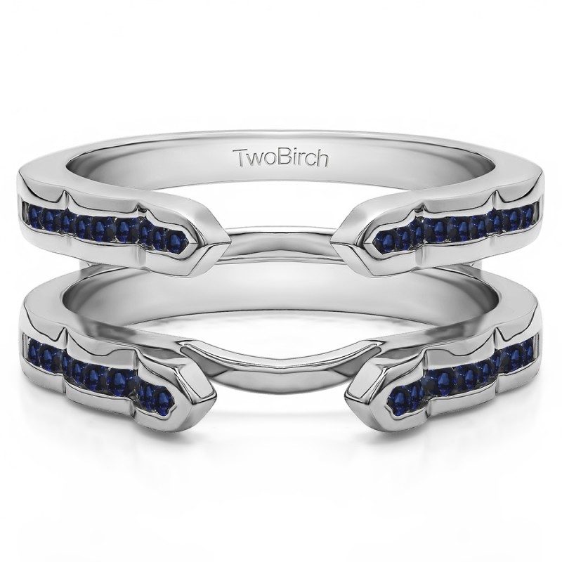 This wedding ring guard has 40 round, channel set stones. Each band measures 2 millimeters wide. This ring guard has 0.4 carats total weight. It is made to fit a round or marquise cut solitaire from 0.5 carats to 2, or a princess cut solitaire from 0.75 up to 2 carats.