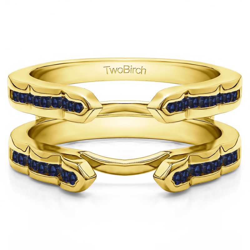 This wedding ring guard has 40 round, channel set stones. Each band measures 2 millimeters wide. This ring guard has 0.4 carats total weight. It is made to fit a round or marquise cut solitaire from 0.5 carats to 2, or a princess cut solitaire from 0.75 up to 2 carats.