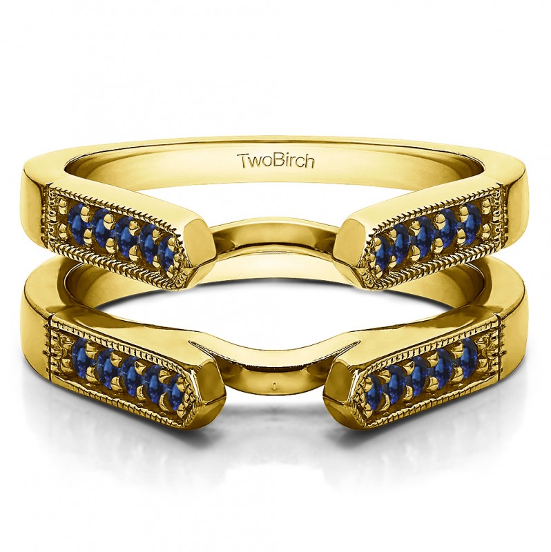 This wedding ring guard has 20 round, channel set stones. Each band measures 2.1 millimeters wide. This ring guard has 0.4 carats total weight. It is made to fit a round, marquise, or princess cut solitaire from 0.75 carats to 2 carats.