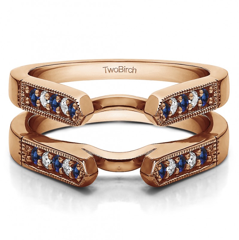 This wedding ring guard has 20 round, channel set stones. Each band measures 2.1 millimeters wide. This ring guard has 0.4 carats total weight. It is made to fit a round, marquise, or princess cut solitaire from 0.75 carats to 2 carats.