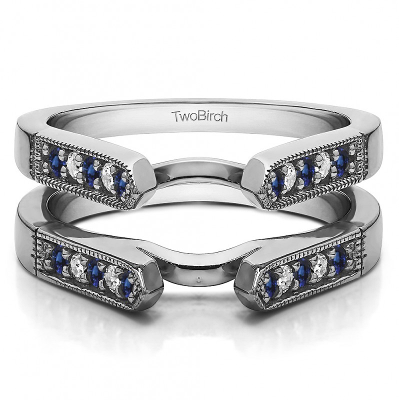 This wedding ring guard has 20 round, channel set stones. Each band measures 2.1 millimeters wide. This ring guard has 0.4 carats total weight. It is made to fit a round, marquise, or princess cut solitaire from 0.75 carats to 2 carats.