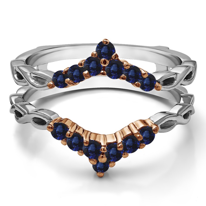 This wedding ring guard has 14 round, prong set stones. Each band measures 1.85 millimeters wide. This ring guard has 0.45 carats total weight. It is made to fit a round solitaire from 0.75 carats to 1.5, or a princess cut solitaire from 0.5 up to 2, or a marquise solitaire from 0.5 up to 1 carats.