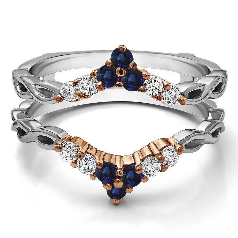 This wedding ring guard has 14 round, prong set stones. Each band measures 1.85 millimeters wide. This ring guard has 0.45 carats total weight. It is made to fit a round solitaire from 0.75 carats to 1.5, or a princess cut solitaire from 0.5 up to 2, or a marquise solitaire from 0.5 up to 1 carats.