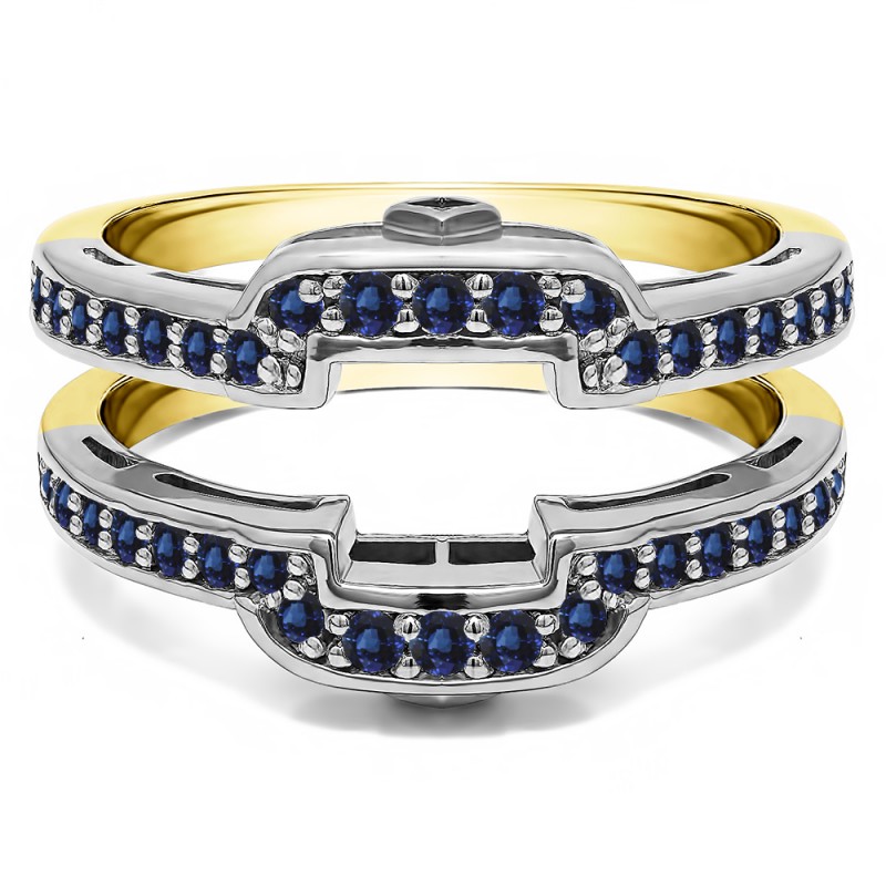 This wedding ring guard has 40 round, channel set stones. Each band measures 2.2 millimeters wide. This ring guard has 0.5 carats total weight. It is made to fit a round solitaire from 0.25 carats to 2, or a princess cut solitaire from 0.5 up to 2 carats.