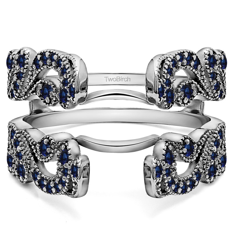 This wedding ring guard has 56 round, prong set stones. Each band measures 2 millimeters wide. This ring guard has 0.5 carats total weight.