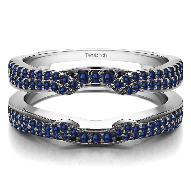 This wedding ring guard has 94 round, prong set stones. Each band measures 2.22 millimeters wide. This ring guard has 0.5 carats total weight. It is made to fit a round solitaire from 0.5 carats to 1.5, or a princess cut solitaire from 0.5 up to 2, or a marquise solitaire from 0.75 up to 1.5 carats.